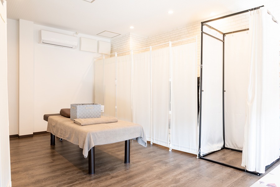 見ていただける通り、琉瑠整体院の店内は白を基調とした明るい雰囲気。日頃の疲れをゆっくり癒せる空間をイメージしレイアウトにもこだわっています。店内中央に、広々とベッドを贅沢に置いています。開放的な空間で施術を受けていただくことで、心にも余裕が生まれます。リラックスした状態で当院の施術をご堪能ください。